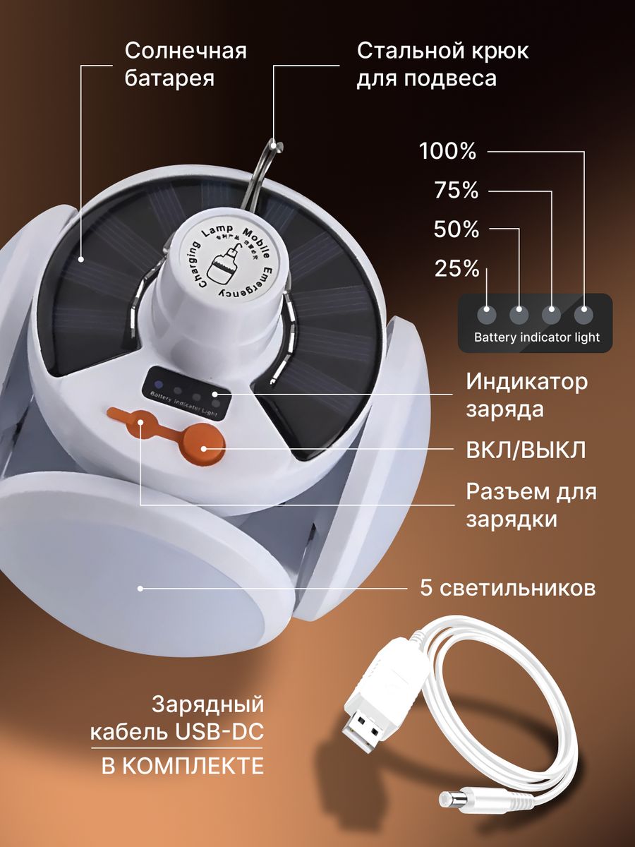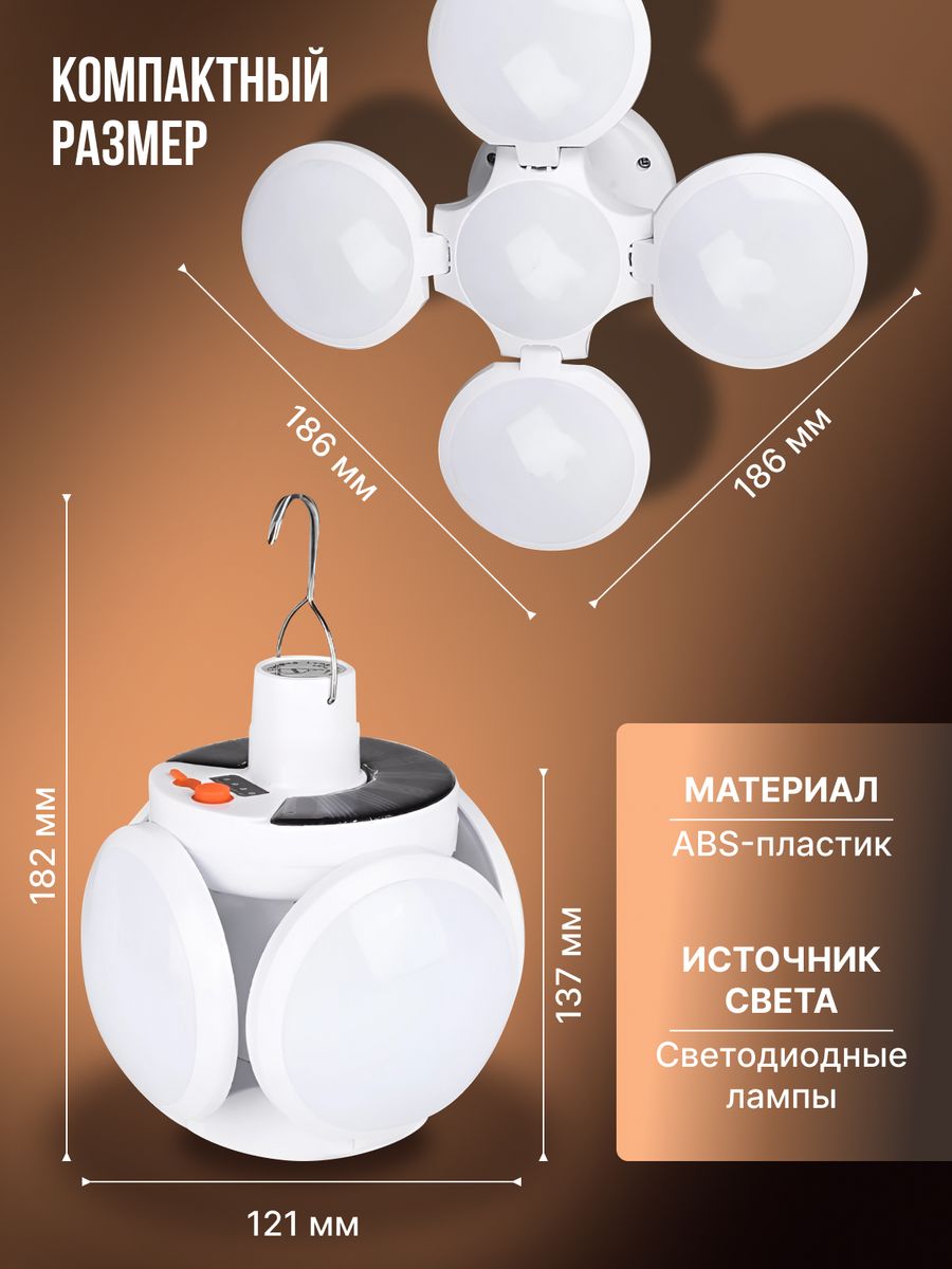 Lanternă de camping LED reîncărcabilă cu energie solară, este una dintre cele mai populare bunuri turistice pentru cabana de vară și grădină, sport și turism. Încărcare de la soare și de la rețeaua 220V. Lanterna este un asistent de încredere în sezonul dacha pe vânătoare, pescuit, pentru cort, deoarece nu necesită fire. Lanterna cu baterii LED este ușoară și ușor de utilizat. Lanterna suspendată are becuri cu diode, panou solar, cârlig de oțel, cablu USB.