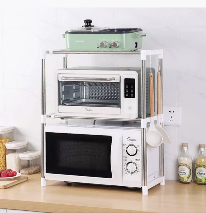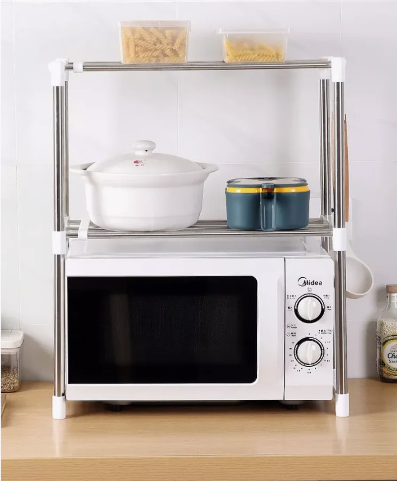 Raftul permite organizarea eficientă a spațiului, oferind două polițe largi care susțin cu ușurință cuptorul și alte ustensile de bucătărie