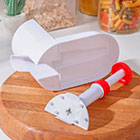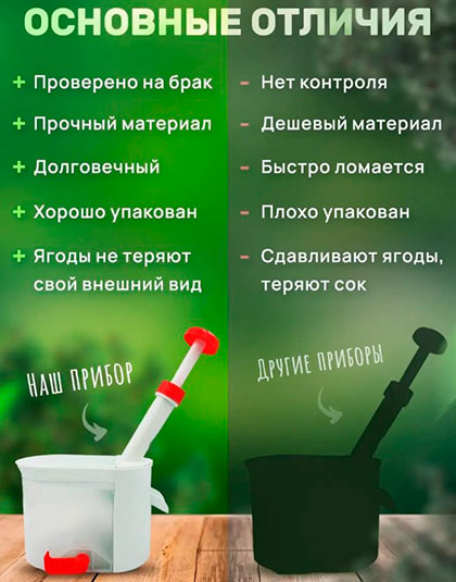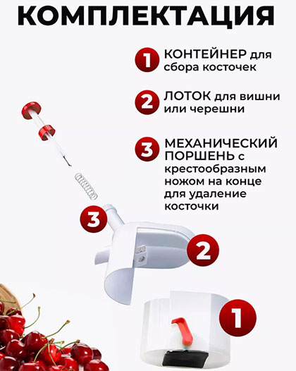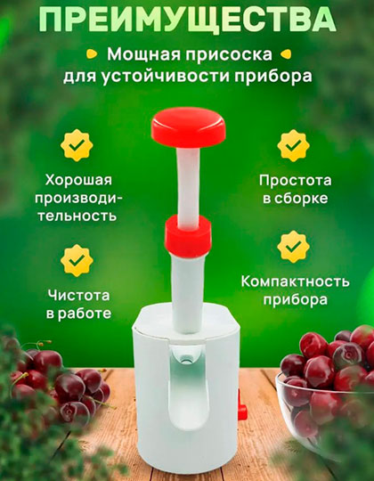 Отделитель косточек вишни изготовлен из качественного пищевого полипропилена, который в процессе чистки ягод не окрашивается в красный цвет от вишни и легко моется, присоска на дне вишнечистки сделана из резины, нож прибора изготовлен из нержавеющий стали.